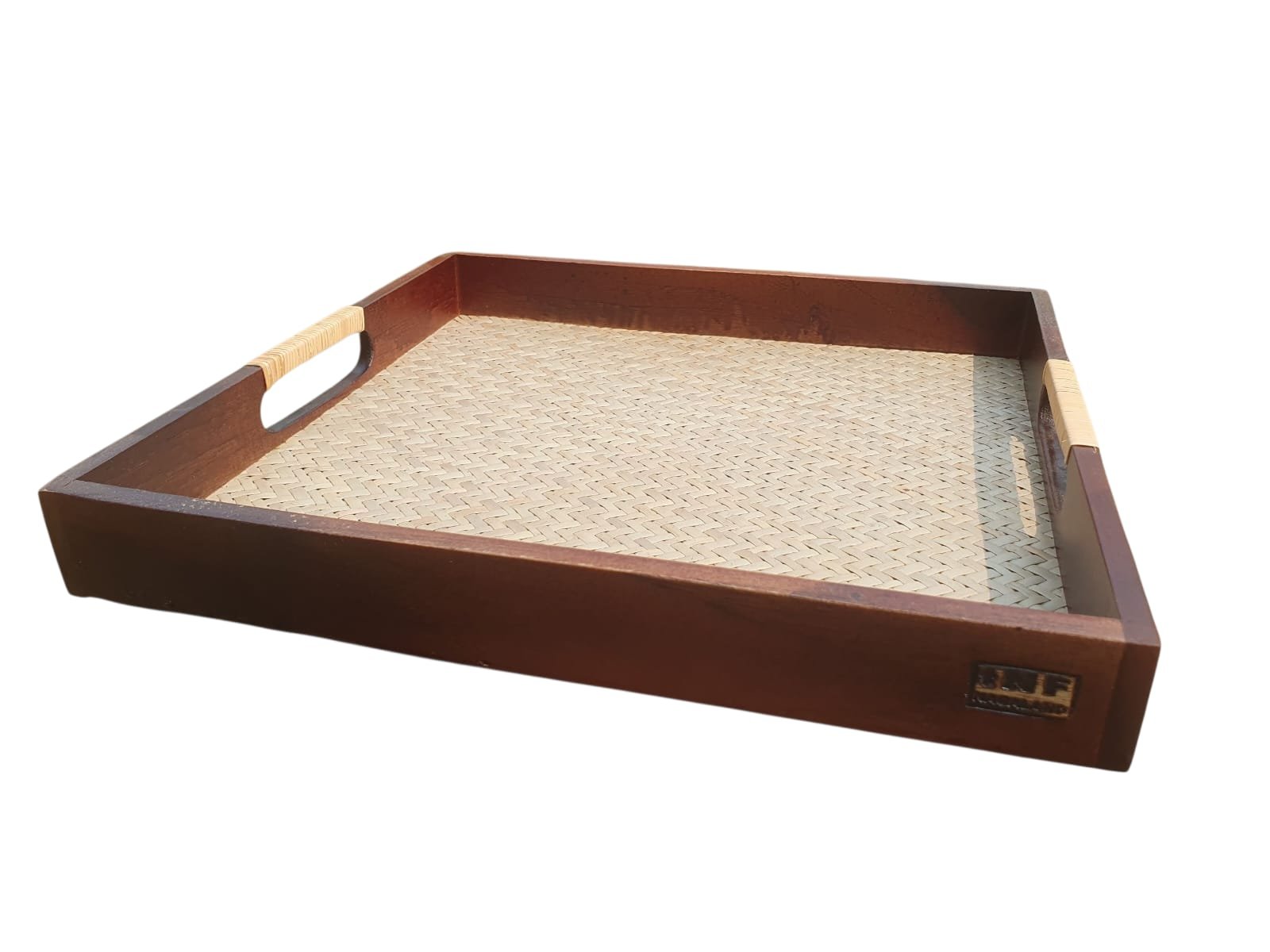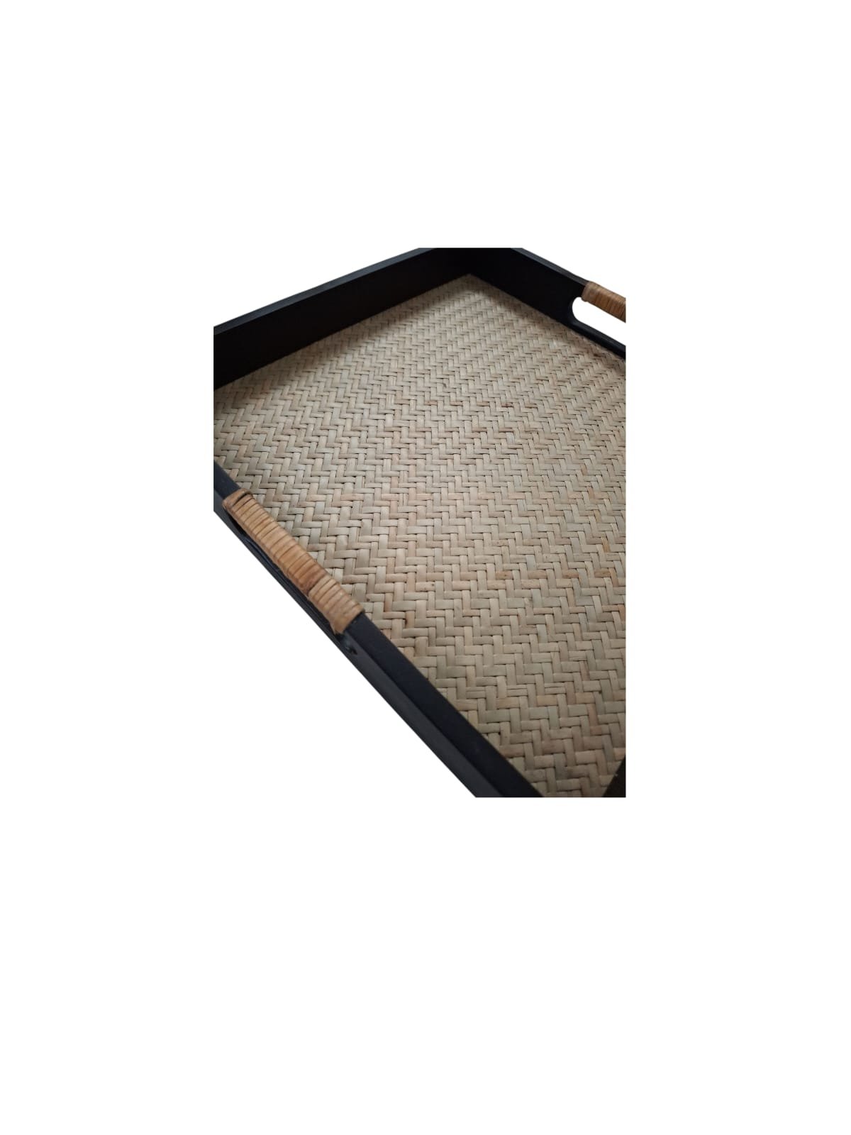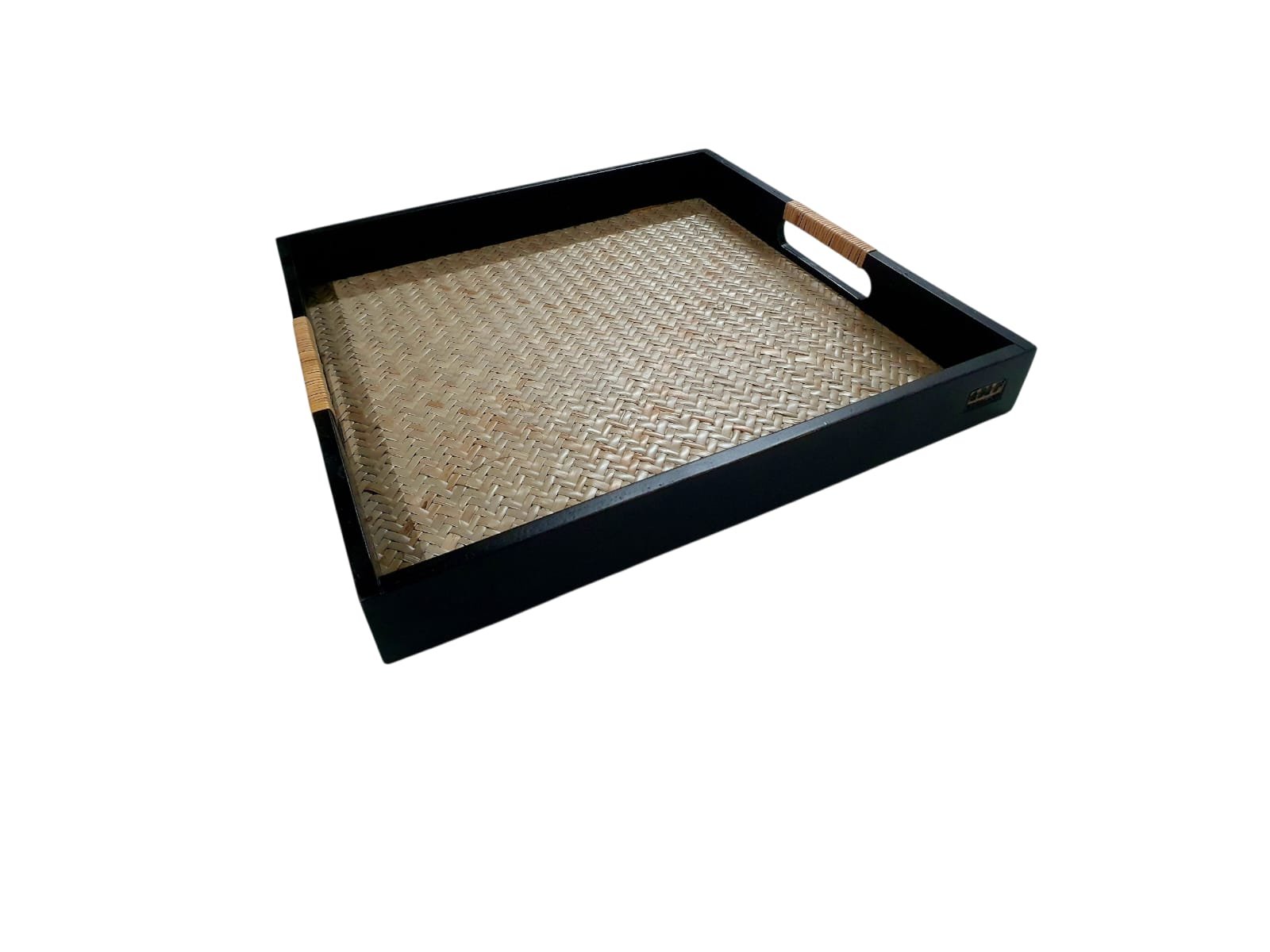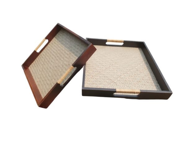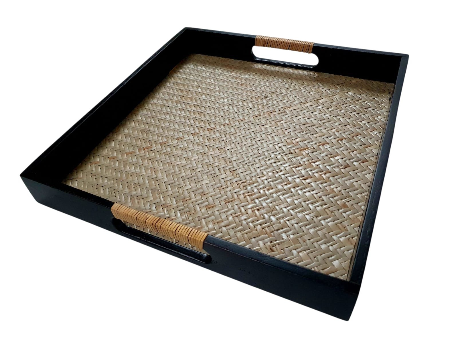 This square tray blends traditional handicraft with contemporary finish . In stock, available in black and brown outer frame ,made in Nagaland , India .